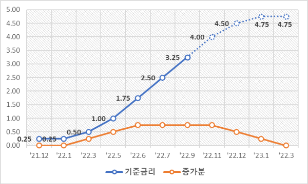 골드만삭스, JP모건 등 대형 투자은행(IB)은 23년에 미국 기준금리가 4.75~5%에서 정점을 찍고 끝날 것이라는 예상이다.